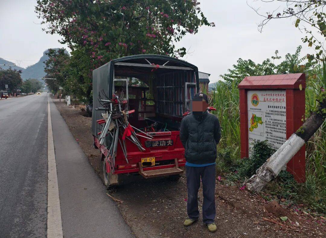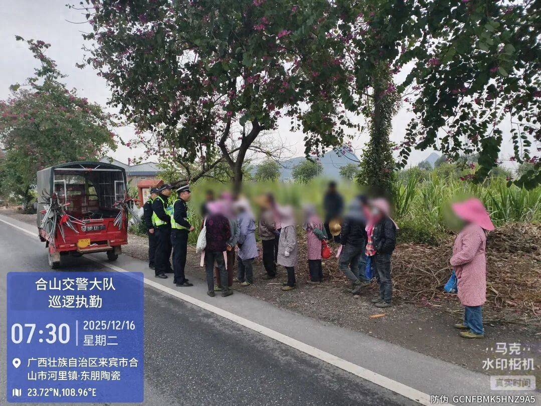 当日7时29分,合山交警在国道G322线辖区河里镇长模村路段开展整治工作时,一辆行驶缓慢的正三轮载货摩托车引起了执勤交警的注意。该车明显加装了车棚,棚内载有多名人员,十分拥挤,且车上还用绳子绑着尖锐的农具。民警立即示意车辆靠边停车接受检查。