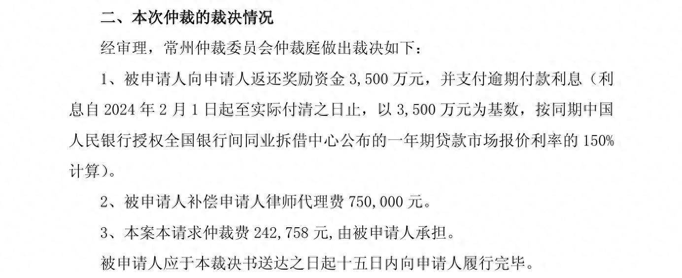 经审理,常州仲裁委员会仲裁庭做出裁决,公司向常州高新区管委会返还奖励资金3500万元并补偿常州高新区管委会律师代理费75万元。