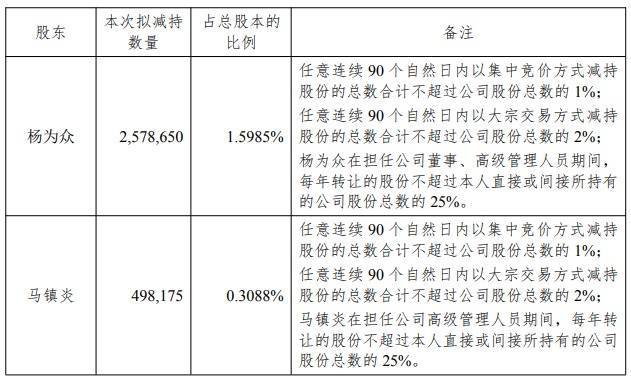 公司高级管理人员马镇炎持有公司股份1,992,700股(占公司总股本的1.2353%),计划在公告披露之日起15个交易日后的3个月内以集中竞价和(或)大宗交易方式减持公司股份不超过498,175股(占公司总股本的0.3088%),其中,通过集中竞价方式减持的股份总数不超过公司总股本的1%,通过大宗交易方式减持的股份总数不超过公司总股本的2%。