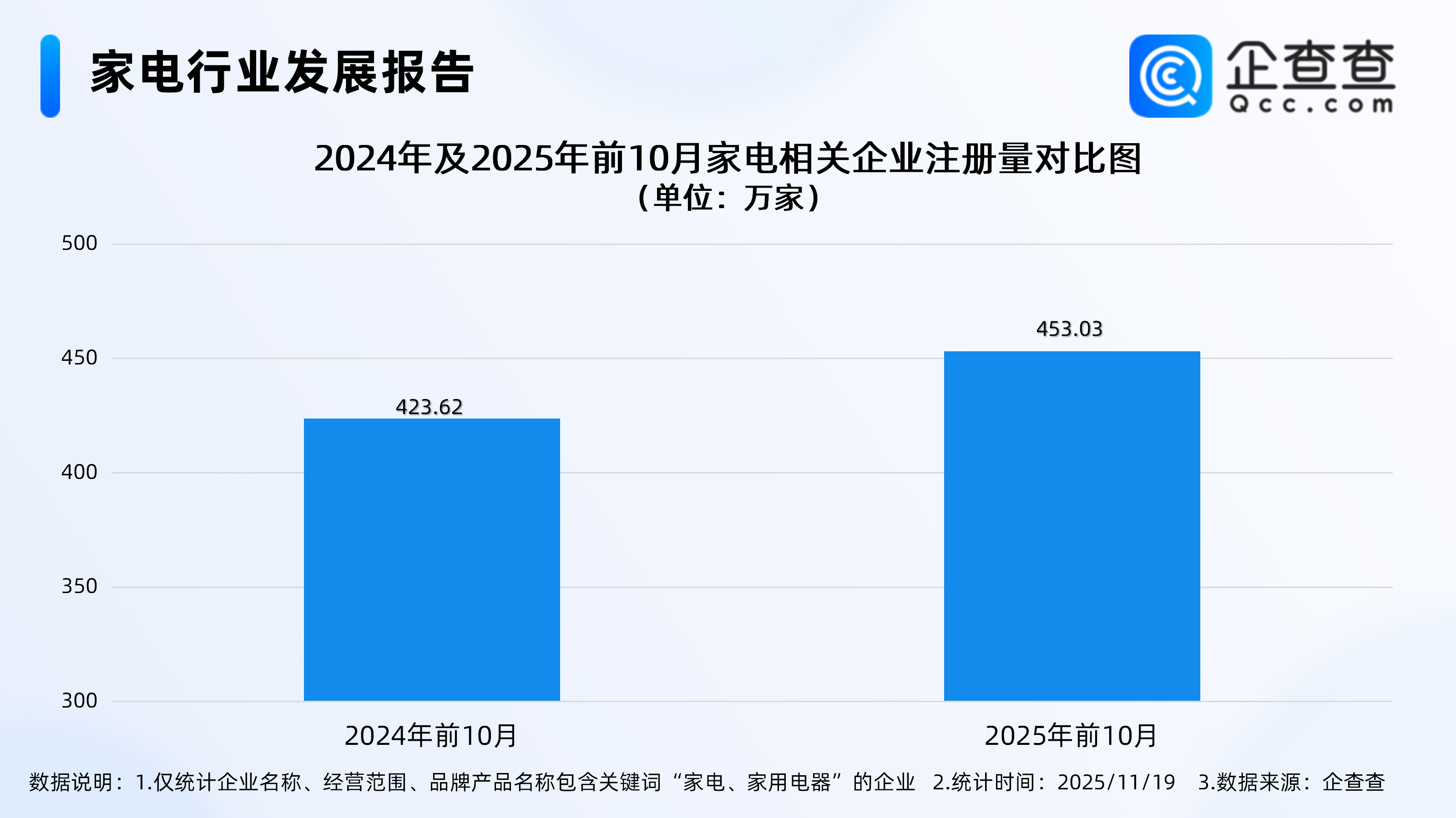 据媒体报道,市场监管总局(国家标准委)近日批准发布《智能家用电器的智能化技术要求和评价第1部分:通用要求》(GB/T28219.1—2025)、《智能家用电器应用场景第1部分:通用要求》(GB/T46505.1—2025)等国家标准,将于2026年5月1日正式实施。这两项国家标准从“智能能力”和“场景效果”两个关键维度清晰界定了智能家电,既给企业研发生产确立了规范,也能够让消费者明白选购、安心使用。企查查数据显示,截至11月19日,国内现存家电相关企业2223.48万家。注册量方面,近十年相关企业注册量呈整体增长态势,2024年全年注册521.6万家。截至目前,今年已注册480.22万家,其中前10月注册453.03万家,同比增长6.94%。存量方面,从经营时间来看,家电相关企业多成立于近三年,成立年限在1-3年的相关企业最多,占比达32.07%。从地区分布来看,家电相关企业主要分布在华东地区,占比30.21%。1.今年前10月相关企业注册量同比增长6.94%