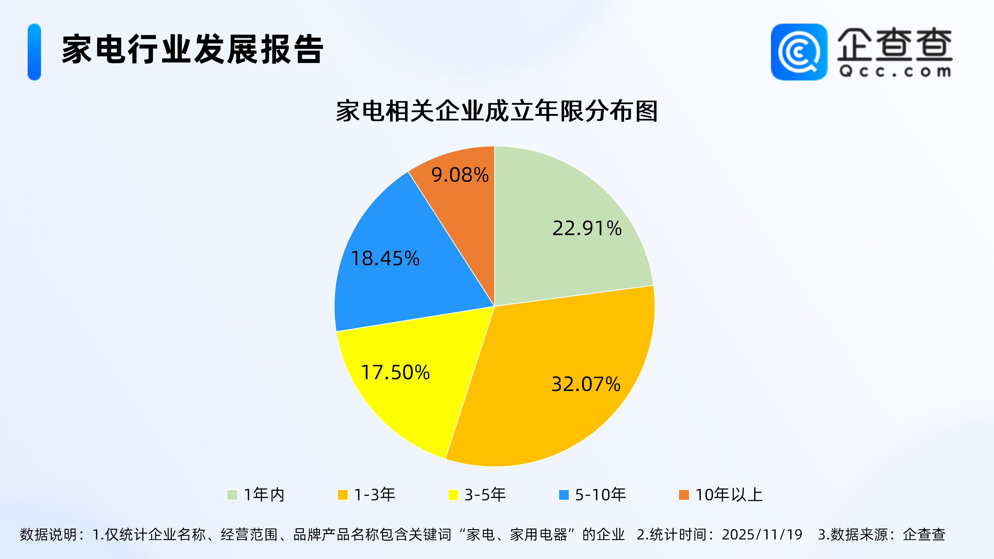 企查查数据显示,截至11月19日,国内现存家电相关企业2223.48万家。近十年相关企业注册量呈整体增长态势,其中2023年全年注册量首次突破500万家,同比增长49.80%至550.63万家。2024年注册量有所下滑,但仍处于高位,全年注册521.6万家。截至目前,今年已注册480.22万家,其中前10月注册453.03万家,同比增长6.94%。2.家电相关企业多成立于近三年